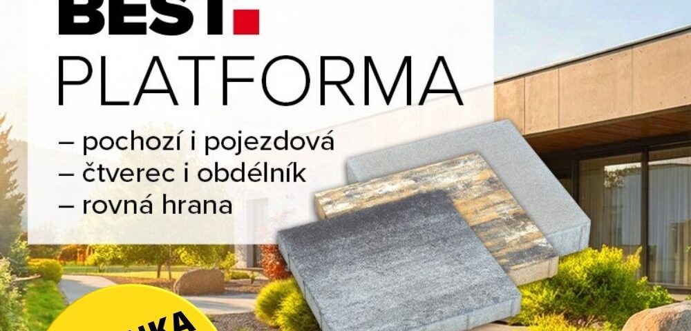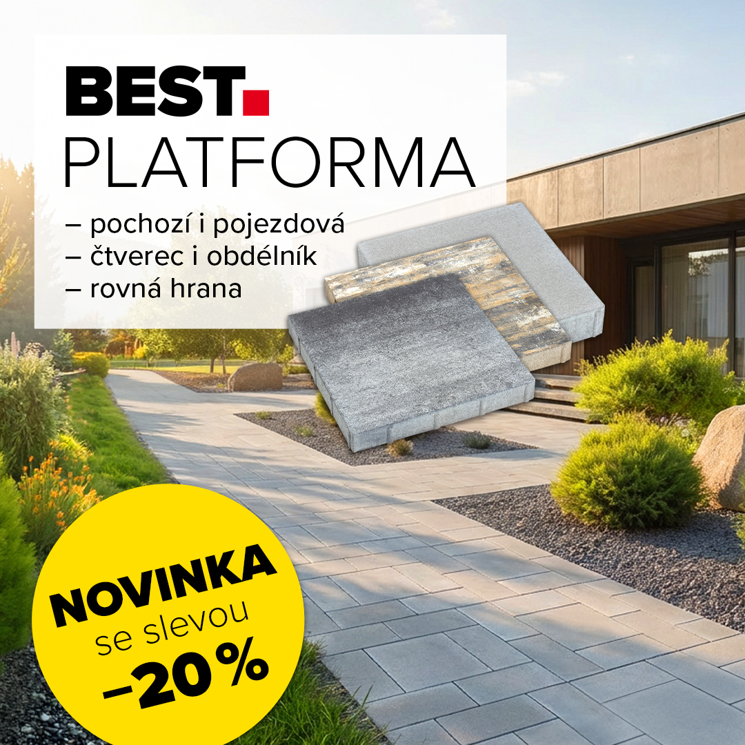 Betonová dlažba BEST PLATFORMA s moderním vzhledem a vysokou odolností je novinkou v sortimentu. Nabízí dva formáty – čtvercový a obdélníkový – a dvě výškové varianty, díky nimž je vhodná jak pro pochozí, tak pojezdové plochy.